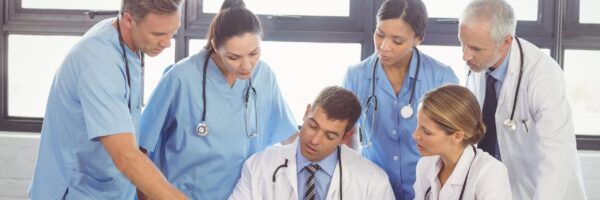Group of five medical professionals in scrubs and white coats attentively discussing over a document, in a bright hospital office setting.