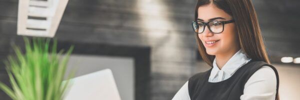 A professional woman with glasses smiles while working at a laptop in a modern office setting, a green plant in the foreground.